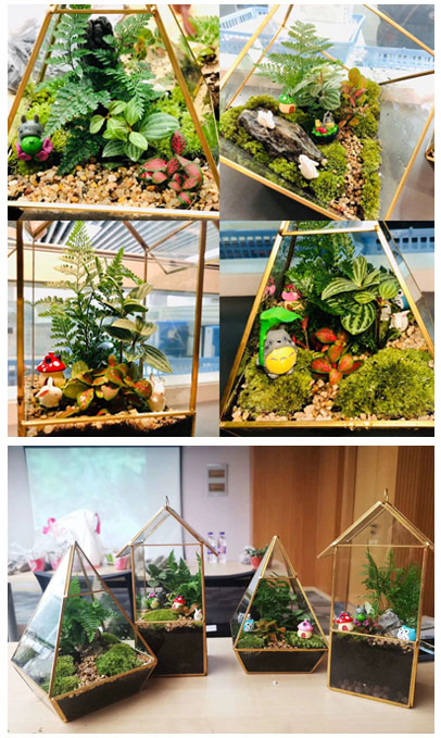在老师的指导下,大家倾注自己的创意,享受DIY的乐趣。经过一个多少小时的精心制作,一盆盆造型别致,独一无二的微世界呈现在眼前。