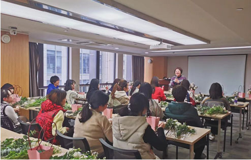 活动现场,花香四溢,到处充满着春天的气息。女同胞们循着花香,踏进花花世界,聆听花草絮语,开启花艺旅程。花艺老师为大家仔细讲解鲜花的插花种类和插花方法,女同胞们跟着老师的指导,运用各自手中的花材,结合自已的审美理解,从鲜花的取材、剪叶、构图、布局开始,不断的进行尝试和实践。