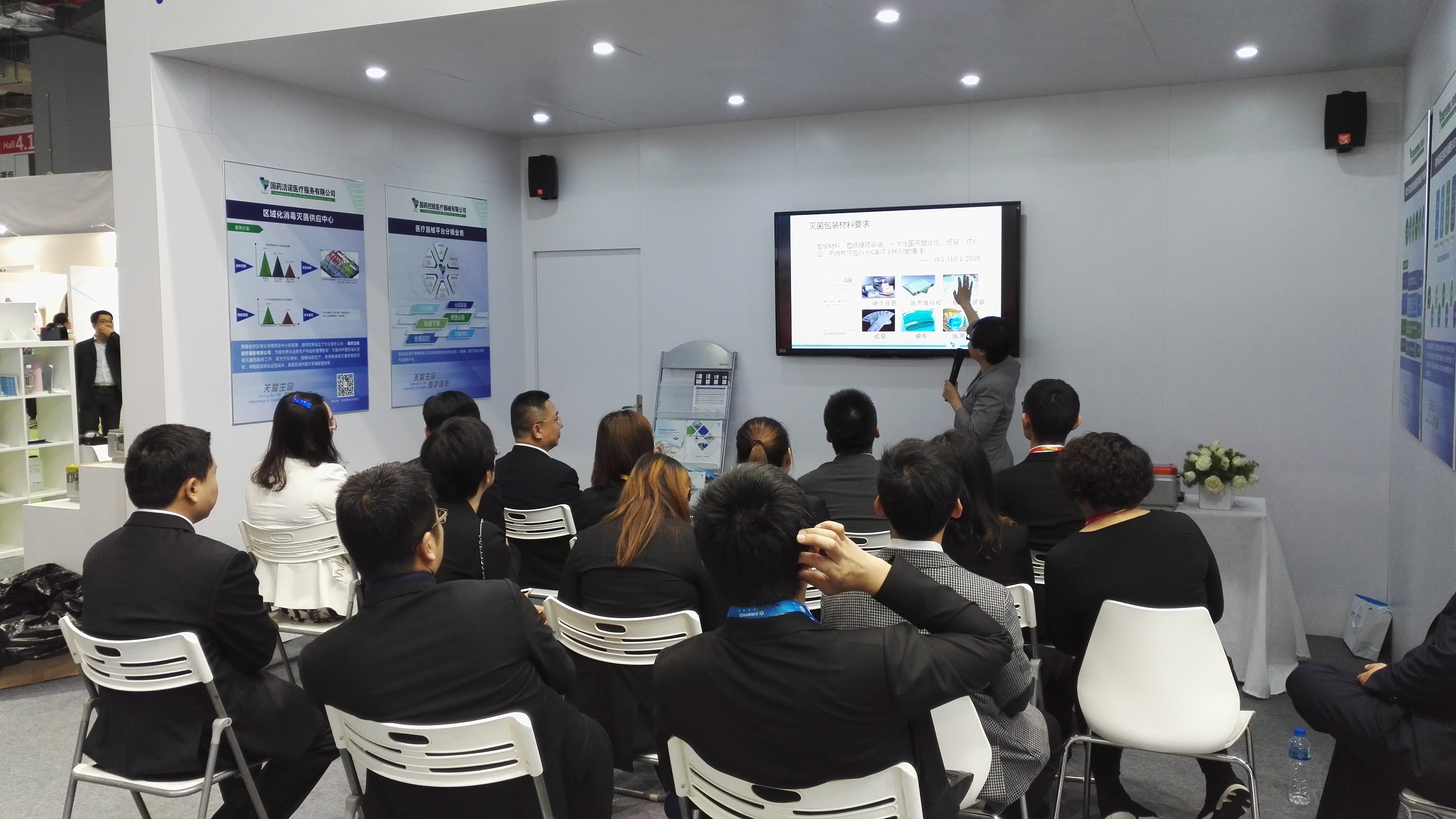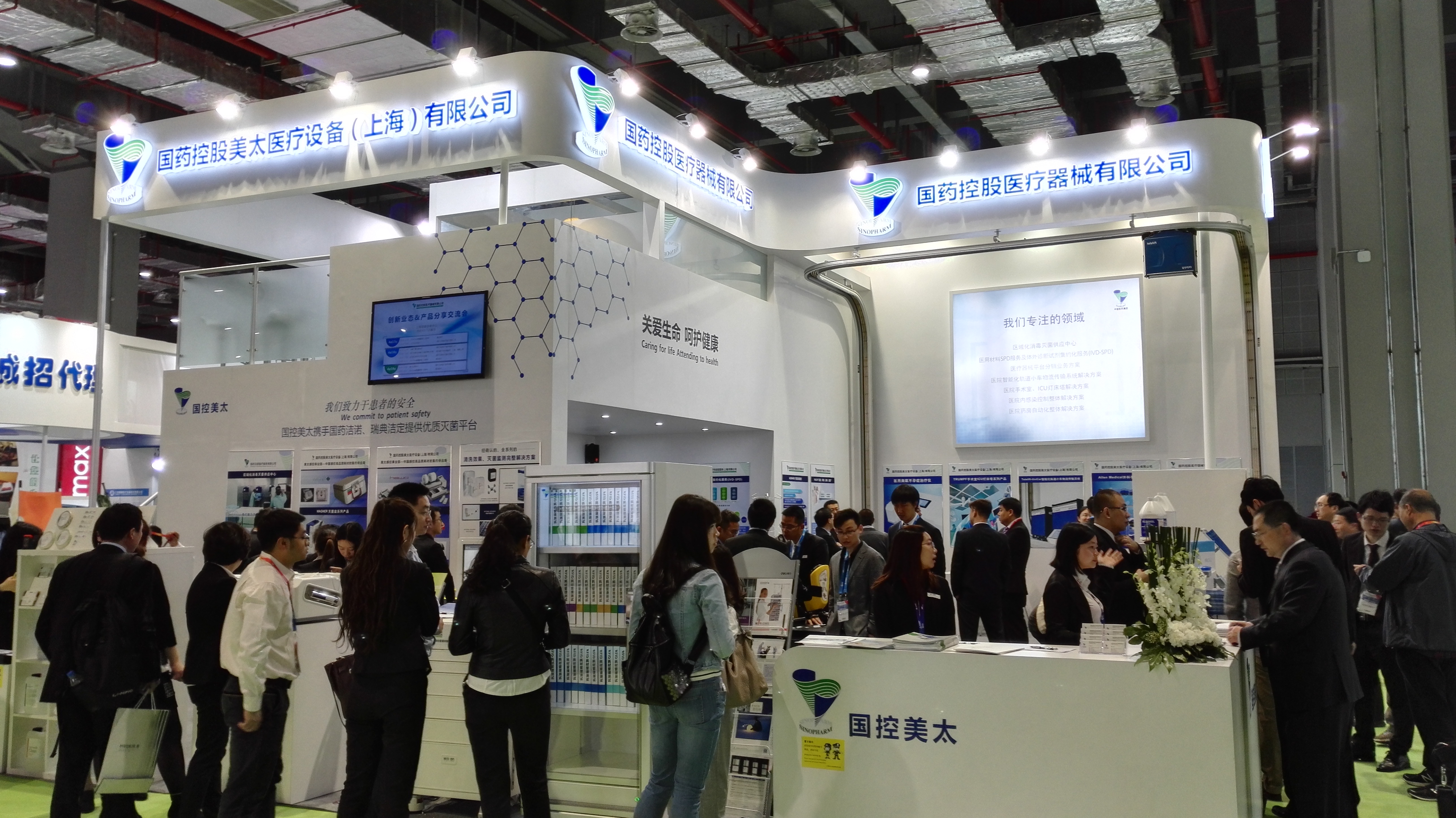 在本届CMEF展会上,国控器械携手国控美太和旗下多家子公司共同参展。展品涵盖公司业务的重点领域:药房自动化、院内感染控制、手术室和最新的院内轨道物流小车等拳头产品。同时展示了公司大力发展的四大创新业态:“医疗器械平台分销业务”、“区域化消毒灭菌供应中心”、“医用材料医院SPD服务”以及“体外诊断试剂集约化服务(IVD-SPD)”。运用展板或实物的形式展示各领域的发展动态。新增了演讲区域,进行现场的分享交流和专业的视频宣传及各业态介绍资料的发放,吸引了超过400位现场观众驻足了解。