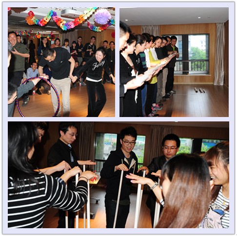 拓展教练首先介绍了拓展活动的目的和由来,然后是通过一系列的欢快活动游戏,营造团队氛围,建立相互信任的基础。紧接着在教练的指导下,全体人员分成三个小组在流水线、团队呼啦圈、不倒森林等活动上进行了火热的比拼。其中流水线时每个成员必须胆大心细,相互合作,培养团结协作能力;不倒森林则强烈意识到,团队成功是个人成功的基础;个人成功必须建立在团队其他成员的共同努力与共同支持的基础之上。在活动过程中,大家热情澎湃,情绪高涨,并不时响起阵阵如雷的掌声。汗水、欢声笑语散落在每一个角落。